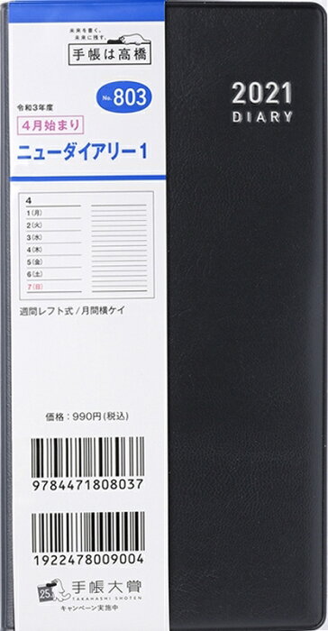 商品名・No.803 ニューダイアリー 1 [黒] 高橋書店 手帳判詳細・始まり年月 :2021年4月始まり・種類 :ビジネス手帳・品番 :84471_no.803・サイズ :B6サイズ・メーカー名 :TAKAHASHI / 高橋手帳・main>手帳>ウィークリー>レフト式・・◆手帳カバー一覧へ◆・週間ページ:レフト式・左ページは各日の記入欄、右ページは罫線のシンプルなレフト式で、自由に使えます。